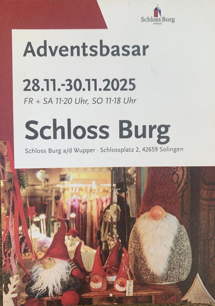 Vom 28. bis 30. November 2025 ist Ute Scholl-Halbach mit ihrer Glaskunst auf dem traditionsreichen Adventsbasar in und um Schloss Burg präsent. Die Aussteller zeigen hochwertige Handwerkskunst in den historischen Höfen, vor der festlich beleuchteten Burg und in stimmungsvollen Räumen.